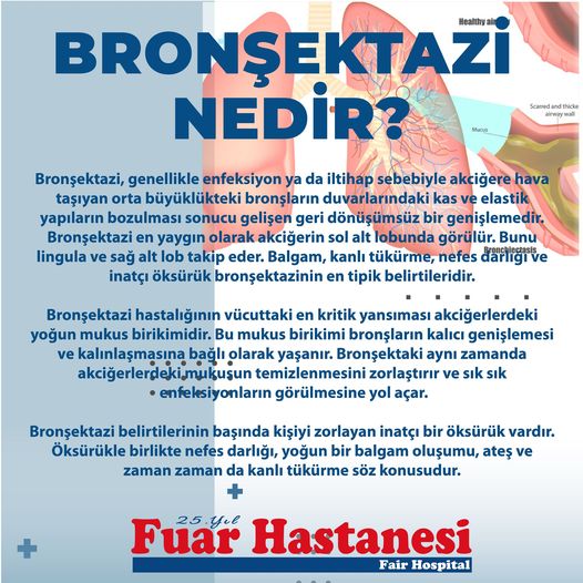 Nezaket Ziyareti: Afyonkarahisar Aile ve Sosyal Hizmetler İl Müdürü Bilal Erdoğan, İl Sağlık Müdürü Uzm. Dr. Serhat Korkmaz'ı Ziyaret EttiBronşektazi, akciğerlerde hava yollarının kalıcı olarak genişlemesi ve hasar görmesiyle sonuçlanan bir solunum hastalığıdır. Hastalığın temel nedeni tekrarlayan enfeksiyonlar ve iltihaplanmalardır. Bu durum akciğerlerde kalıcı hasara neden olabilir. Bronşektazinin belirtileri arasında kronik öksürük, balgam çıkarma, tekrarlayan solunum yolu enfeksiyonları ve nefes darlığı yer alır. Bu belirtiler hastaların yaşam kalitesini önemli ölçüde etkileyebilir. Uzmanlar, bronşektazi hastalığının erken tanı ve uygun tedavi ile kontrol altına alınabileceğine dikkat çekmektedir. Erken teşhis, hastalığın ilerlemesini önleyebilir ve hastaların günlük yaşamlarını daha sağlıklı bir şekilde sürdürmelerine imkan tanıyabilir.
